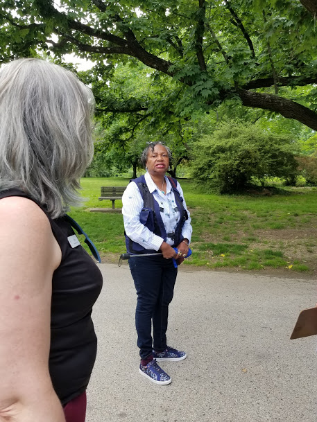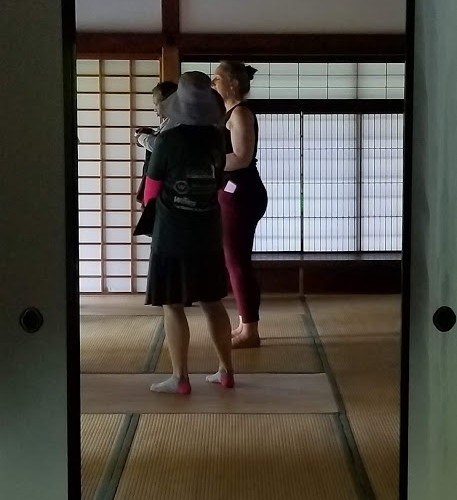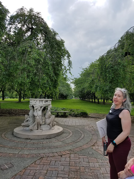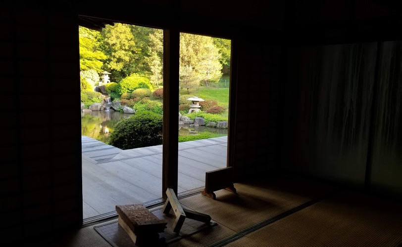 At 5:30, we met with more Women in Horticulture at the gate of Shofuso for the tour of the garden and house. We were joined by Lori Hayes, Director of Urban Forestry for the City of Philadelphia, who started as a seasonal Fairmount Park Commission worker from 1980 through the mid-80s, working at Shofuso in the early 1980s. She has been with the City of Philadelphia ever since! She has been the Horticulture Center Manager, spending most of career in West Fairmount Park until she became District Manager based at FDR Park and worked her way up and across the ropes of the trees of Fairmount Park ( literally and figuratively!). Lori spoke of her time at Shofuso and shared a few snapshots from that time, including a picture of her younger sister in front of the Jizo statue and the koi that lived in the pond at the time.