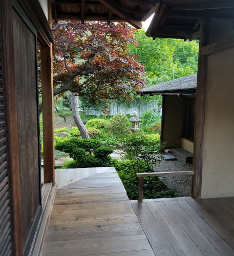 We relaxed outside on the veranda and enjoyed the view of the garden as Kim spoke to us about the history of the Shofuso house and how and why it was relocated to its current site from the Museum of Modern Art in New York. Lori shared anecdotes of the time that she worked at Shofuso, including how she was told to mow the lawn and worked with an all male crew. Kim explained the extensive restoration of the historic landscape over time and the multiple uses that Shofuso has endured, including weddings and other events that taxed the landscape. A Japanese garden is meant to be viewed from the house and its veranda, not walked through as we are used to in the gardens of the West. The view is the thing! The harmony of the colors, shapes, placement of stones and statuary, and view in and beyond the garden are the important elements of the garden. She also spoke of the how the nonprofit has been run by various Boards and volunteers and the complexity of the relationship between Board, staff, and volunteers as she has attempted to remake the Board to be more effective and representative of the diversity of the city and region.